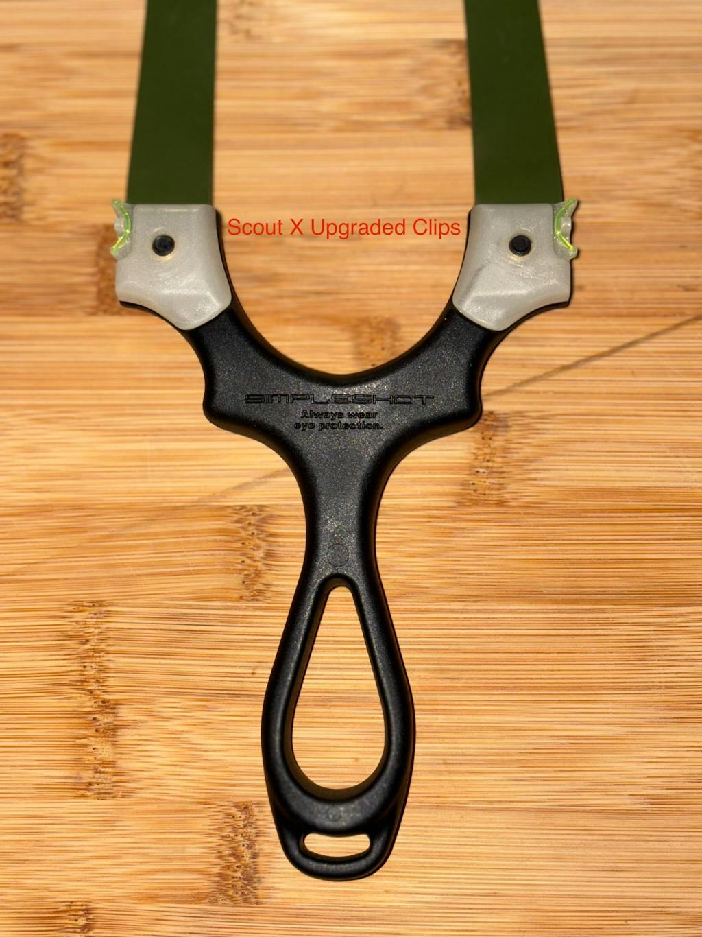 Integrated band attachment clips with recessed fasteners and modern fiber optic sight references for The Scout X Slingshot.